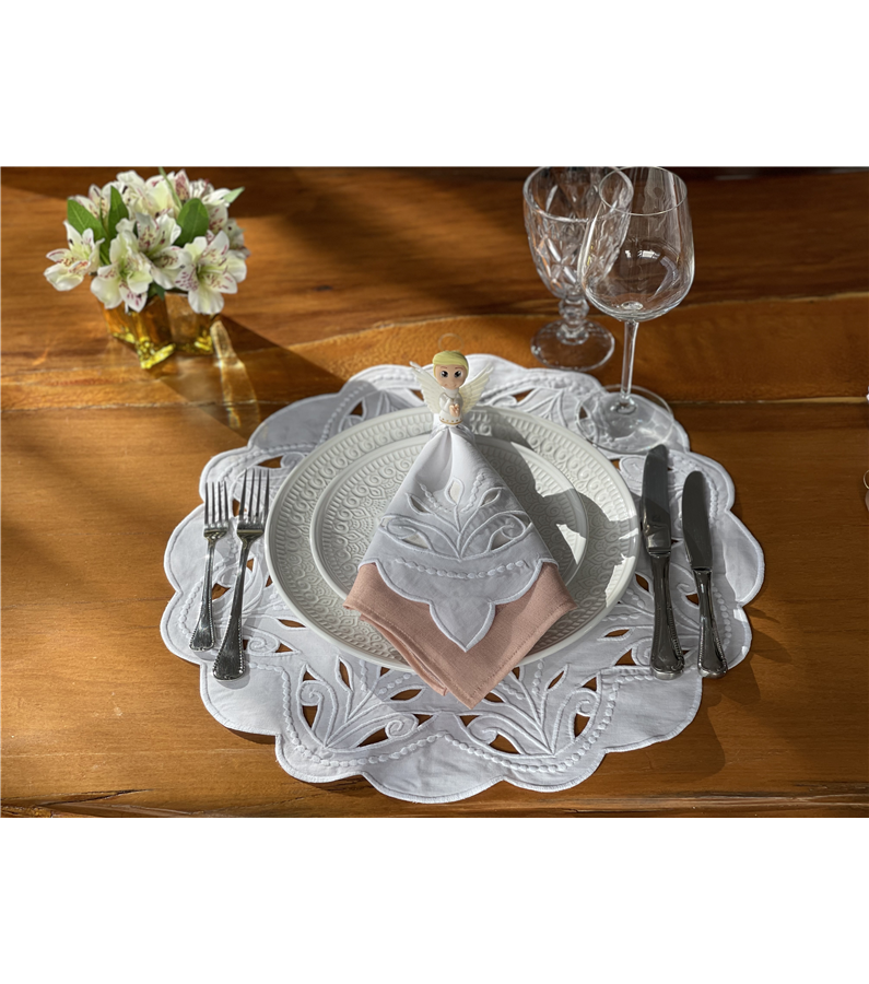 Lindo conjunto de americano com guardanapo em percal com bordado em Richelieu. Americano mede 45cm de diâmetro e guardanapo mede 40 por 40cm.